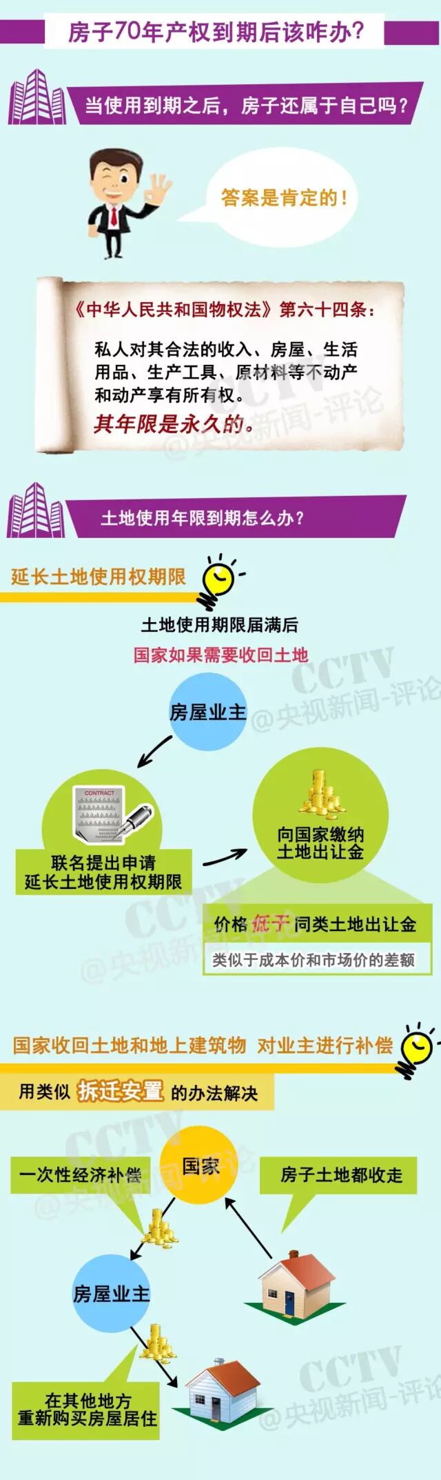 一是不夠70年的,到期後必須都續期到70年;二是70年到期後自動續期,相當於住宅建設用地使用權是一個無期限的物權,即一次取得永久使用,國家不必每次續期每次都收費;三是到期後經過自動續期變成永久性建設用地使用權之後,應當確定使用權人與國家所有權人之間的關係,可以考慮收取必要而不過高的稅金,但應當經過立法機關立法決定。從已經出現的情況來看,比如今年4月深圳某業主因產權到期,花4.5萬將市值600多萬的房子產權延期了20年,即土地使用期限屆滿後,國家如果需要收回土地,產權人可重新辦理土地使用權出讓手續,簽訂土地出讓合同,向國家繳納土地出讓金的方式比較被市場認可。具體繳納的金額需依據國家現行的相關規定,即土地到期後按照當時的樓面毛地指導價格,依一定比例繳費(因具體的樓盤價格和比例各地都有不同規定,在實際工作中大家可以查看一下當地市政機關發佈的相關檔)。
