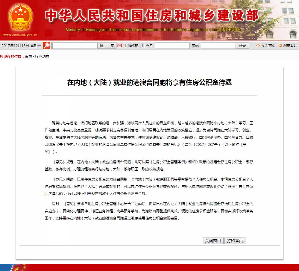 為落實中央要求,住房城鄉建設部、財政部、人民銀行、國務院港澳辦、國務院台辦近日聯合印發《關於在內地(大陸)就業的港澳台同胞享有住房公積金待遇有關問題的意見》(建金〔2017〕237 號)(以下簡稱《意見》)。
